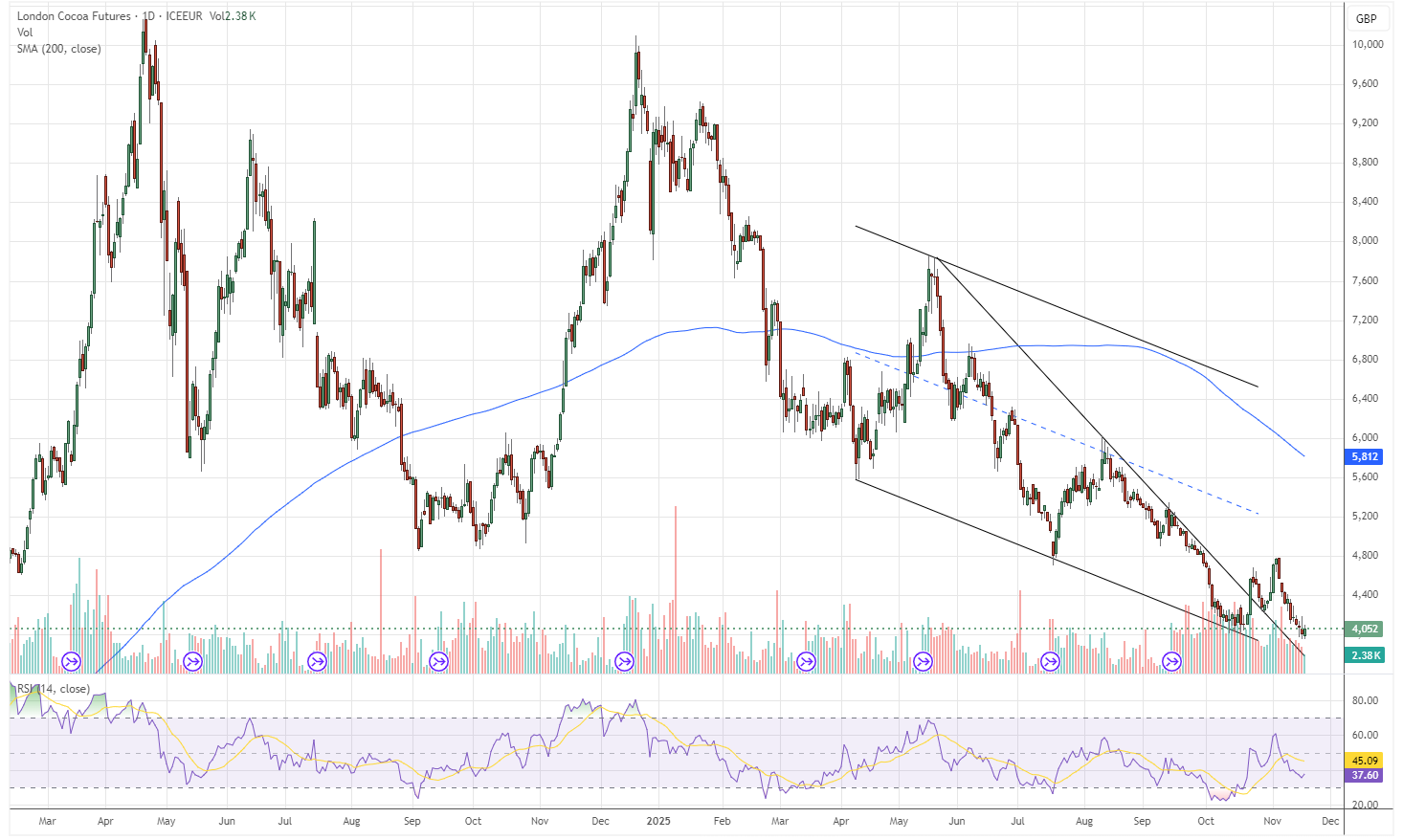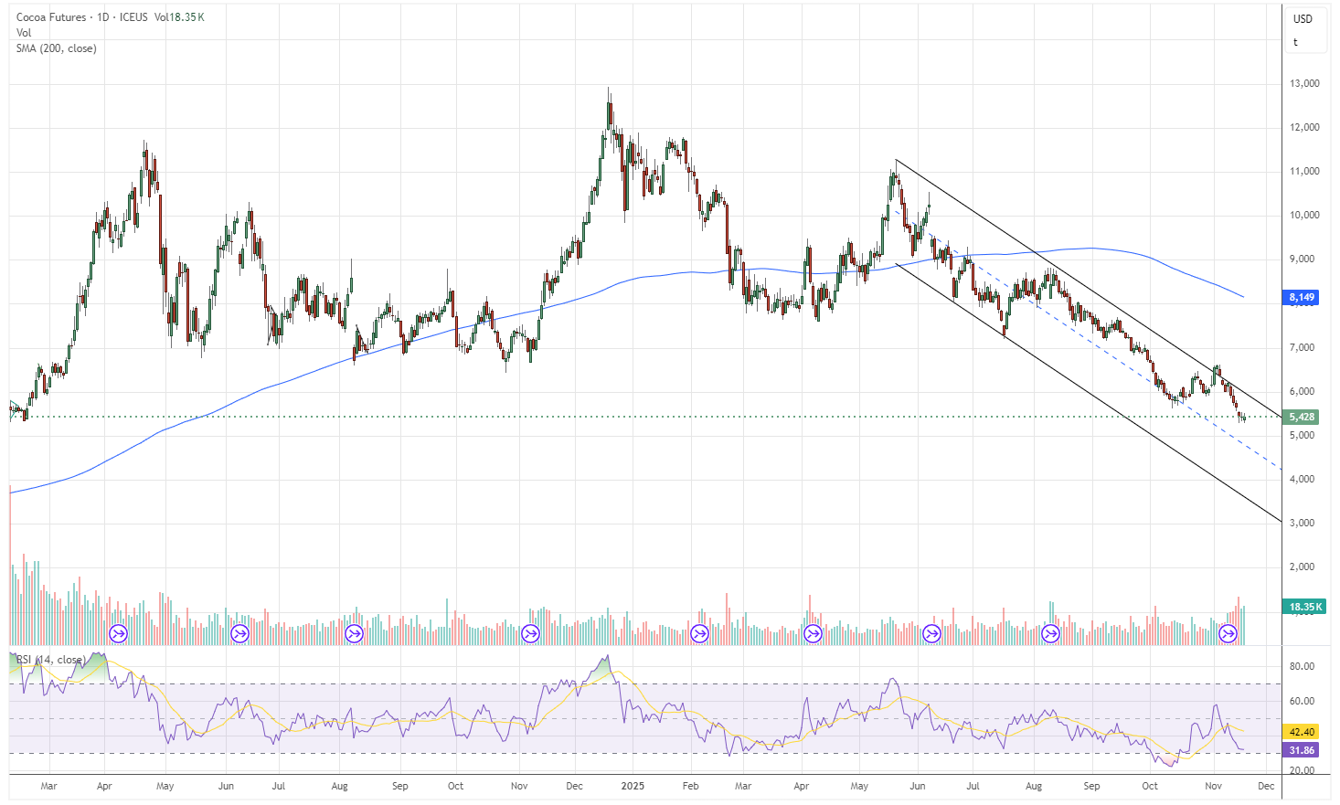 Technically, cocoa is still in a downtrend, but Tuesday’s session slightly eased the immediate pressure.