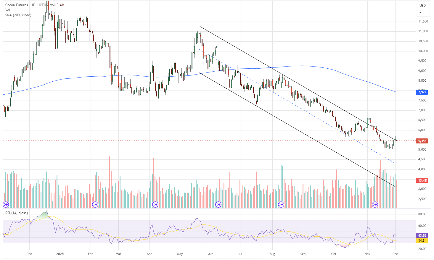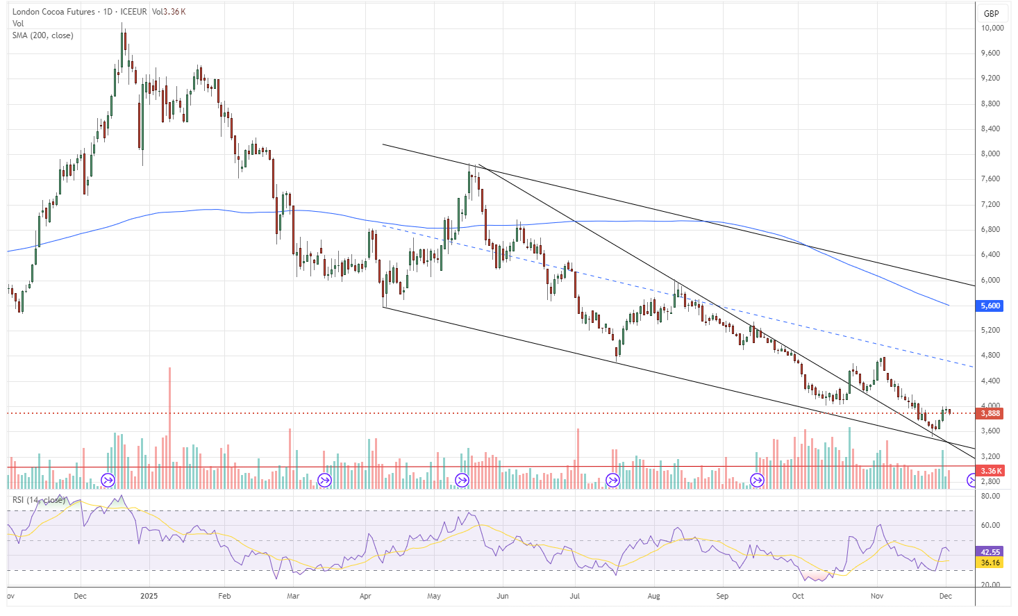 The fundamental backdrop remains mixed. Ivory Coast cocoa arrivals for 2025/26 remain slightly below last season on a cumulative basis but improved week-on-week. However, the CCC’s updated assessment reinforces concerns over declining national output, with current-harvest production estimated at 1.3 million tons, down from 1.7 million tons last year.