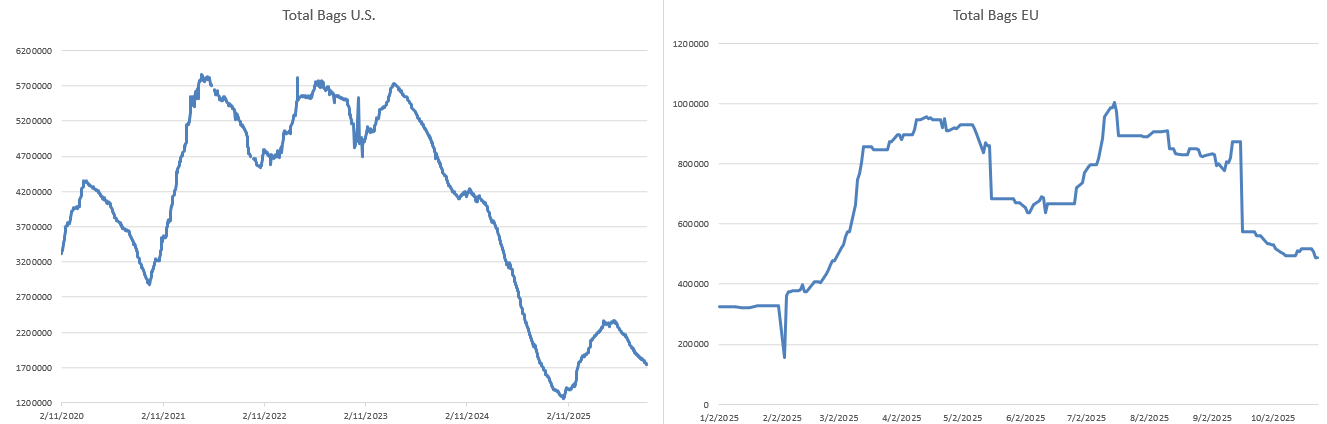 Both US and UK stocks declined, with the UK showing its sharpest daily drop in weeks. Falling certified stocks contradict the idea of a surplus. Stocks and futures are still diverging — a gap that cannot persist if West African supply continues tightening.