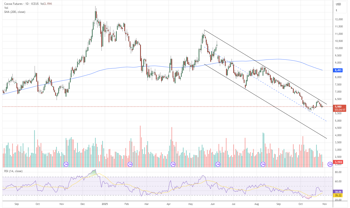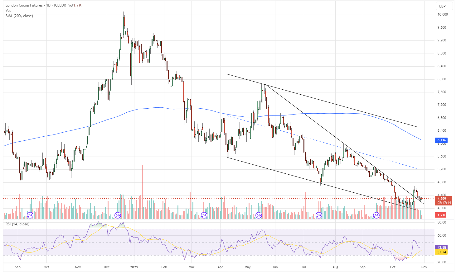 However, demand weakness remains a limiting factor, with buyers reluctant to chase rallies amid soft retail sales and shrinking chocolate margins. Sustained closes above $6,100 in New York and £4,350 in London would confirm renewed bullish momentum, while a drop below $6,000 could invite renewed liquidation.