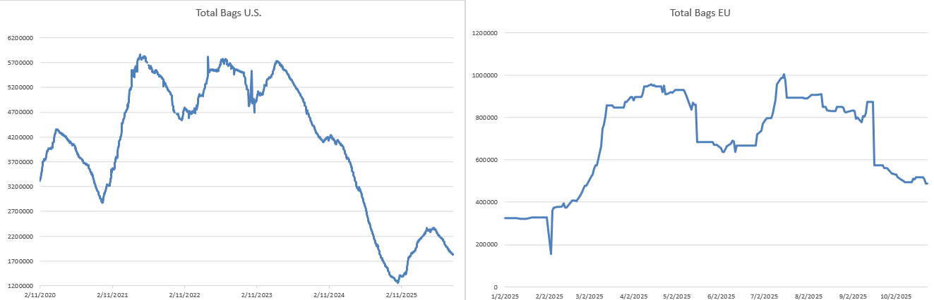 | US Certified Stocks | 1,827,670 bags | 1,836,163 bags | ▼ 8,493 | –0.5 % |