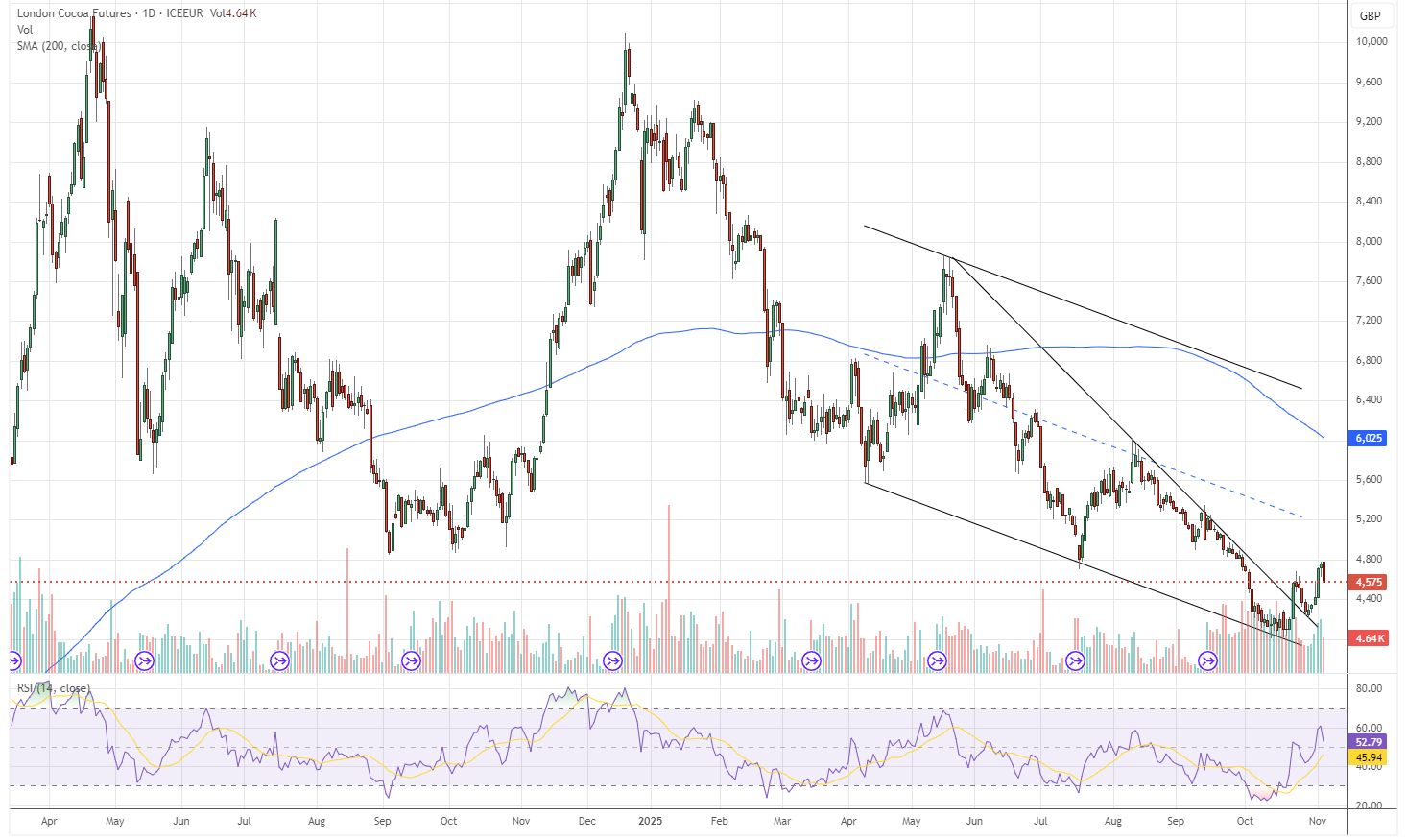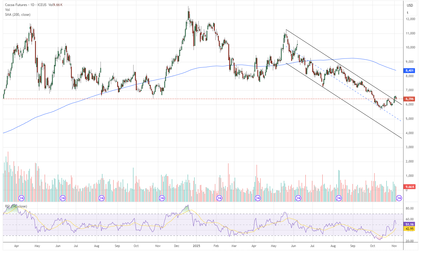 The cocoa forward curves remain in mild contango, signaling that traders expect near-term tightness to ease slightly into early 2026 as new crop arrivals accelerate.