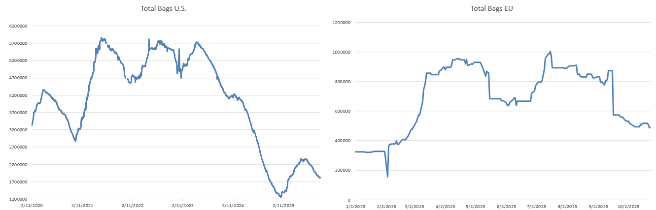 | Location | Nov 5 | Nov 4 | Change (bags) | Tons (64 kg) | % Change |