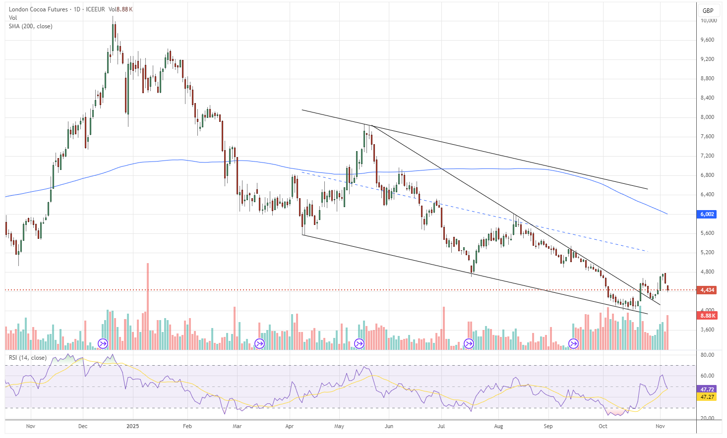 Improved rainfall in West Africa and lower grind data have tempered near-term bullishness, but long-term constraints—aging farms, disease, and limited farmer margins—keep the market underpinned. Price action suggests temporary bearish momentum, not a full reversal of the longer-term uptrend.