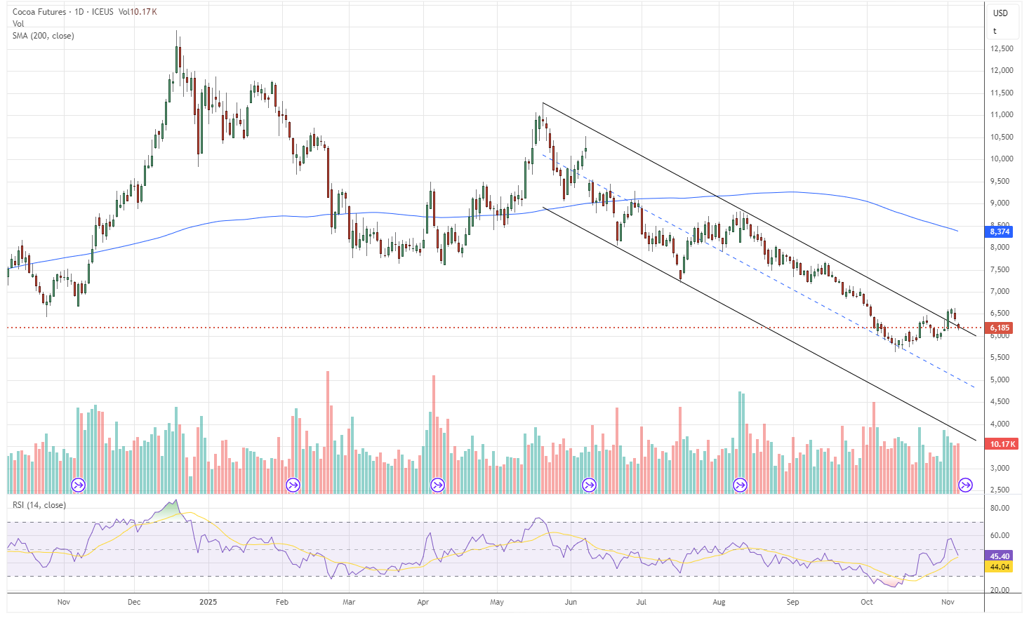 The December contract in New York remains above key short-term support near $6,080, while resistance lies around $6,390–$6,420. In London, nearby support emerges at £4,370, followed by stronger support near £4,300.