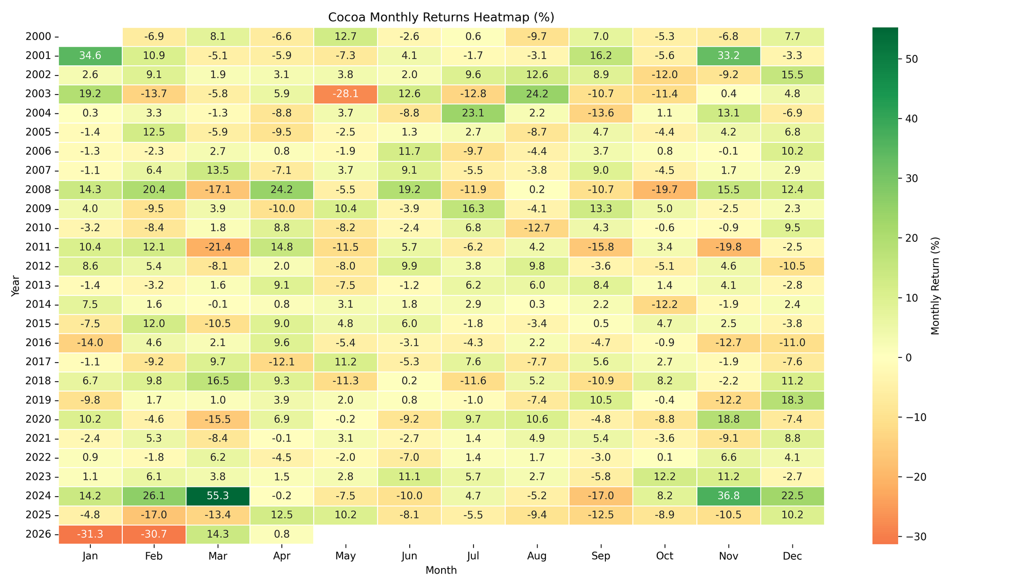 This heatmap shows monthly cocoa price returns for each year.