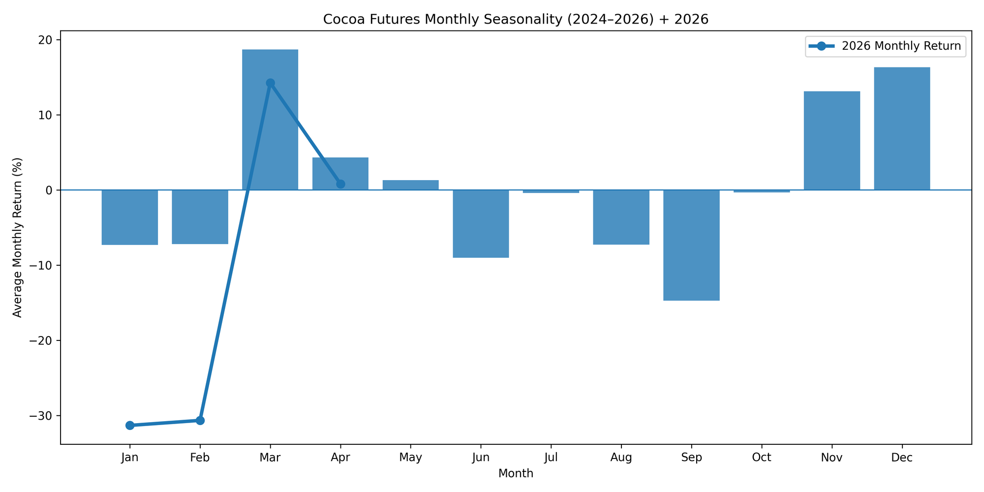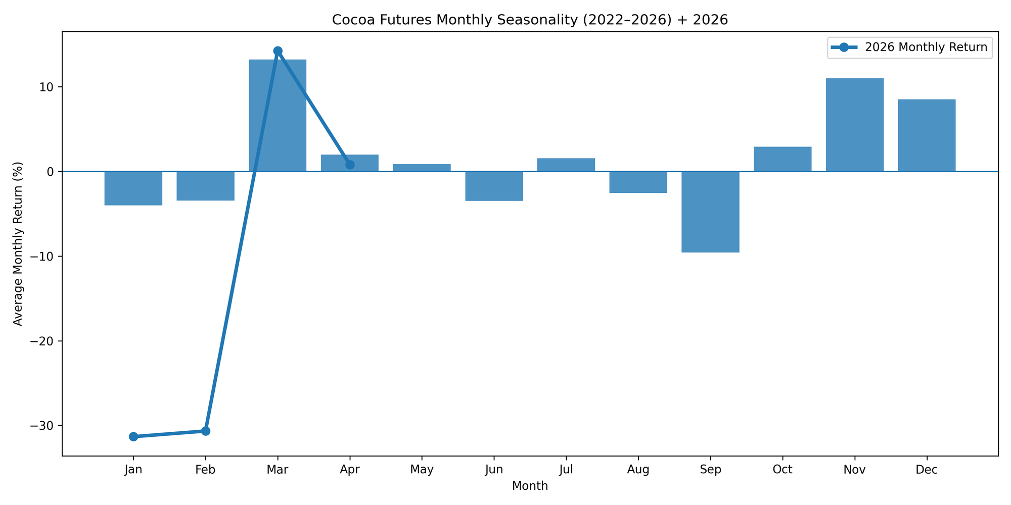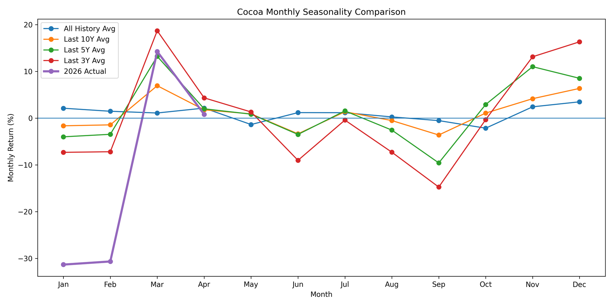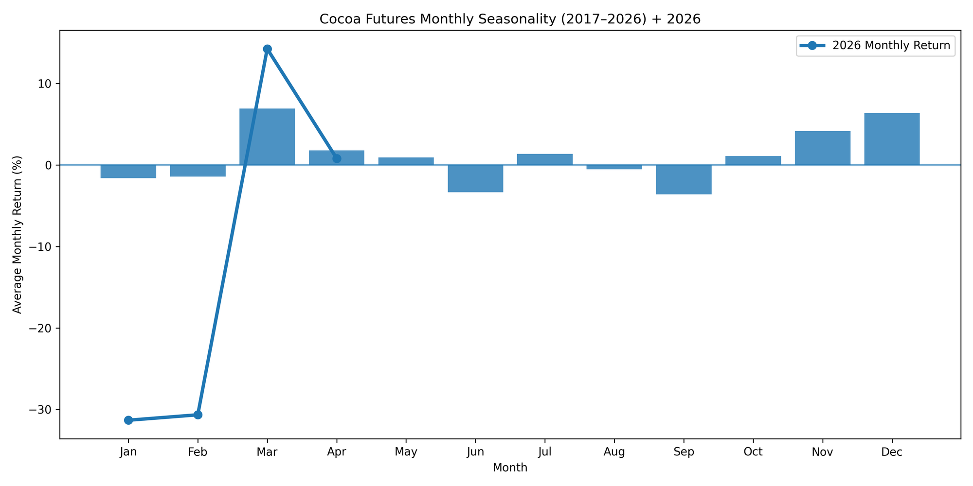 This chart displays the average monthly cocoa returns over the last 10 years.