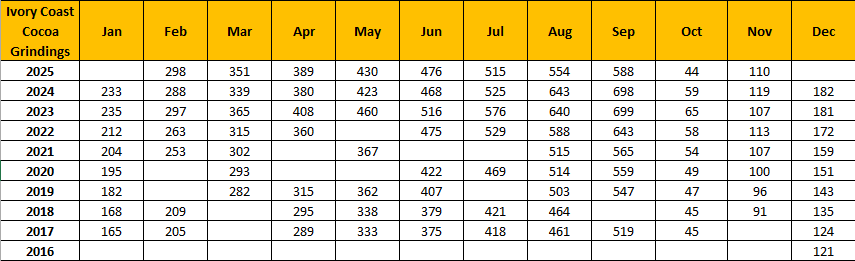 The steep October decline was largely the result of temporary supply tightness, not a structural deterioration in demand. Earlier this year, Côte d’Ivoire mills faced intense pressure from poor pod development, a reduced mid-crop, and logistical constraints that limited bean arrivals during late Q3 and early Q4. Those supply bottlenecks forced mills to reduce throughput even as underlying demand remained stable.