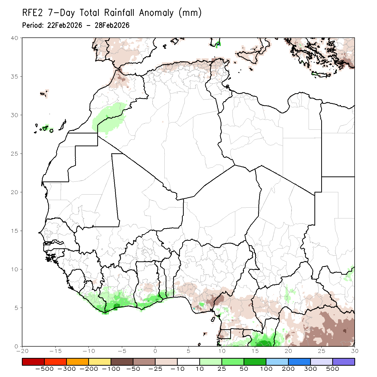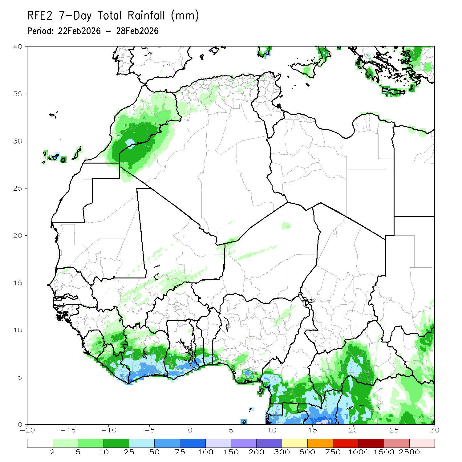 For the week 22–28 February 2026, total rainfall across southern Côte d’Ivoire and southern Ghana was generally moderate. Coastal and southwest Côte d’Ivoire show 40 to 75 millimeters, with some localized blue pockets suggesting near 75 millimeters. Southern Ghana appears mostly in the 25 to 60 millimeter range, lighter inland toward central zones. Northern sections of both countries were largely dry.