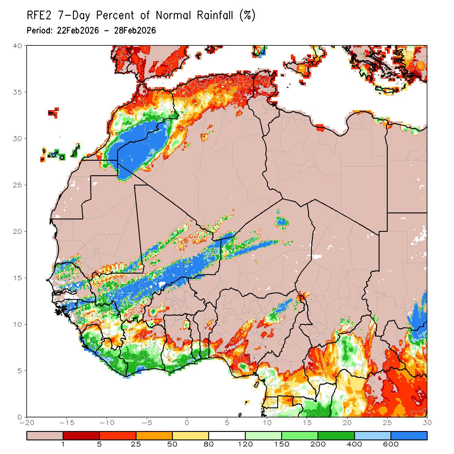 Now the critical part is the anomaly and percent-of-normal maps. The anomaly map indicates that much of the cocoa belt recorded positive rainfall anomalies. The percent-of-normal map shows widespread areas in the 120 to 200 percent range across southern Côte d’Ivoire and southern Ghana, with embedded zones exceeding 200 percent of normal. That means rainfall was significantly above climatological expectations for late February, which is typically still part of the dry season transition.